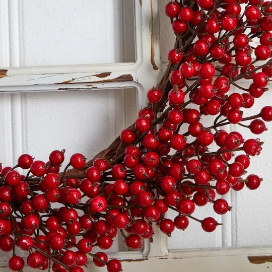 Adorable red berries are woven together to create this playful wreath. It may be tempting to pick off a faux berry to eat, but you should refrain–they only look real! It’s a delightful choice to add to country cottage and holiday decorations.