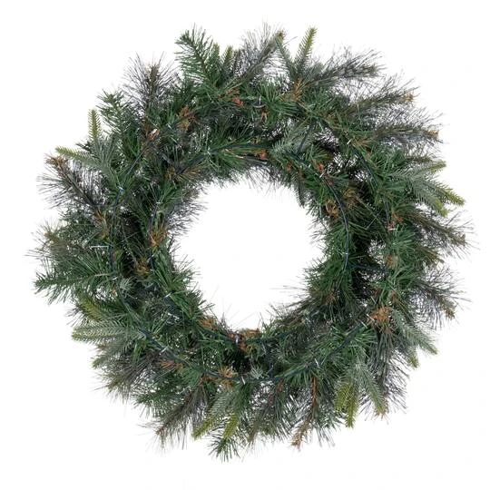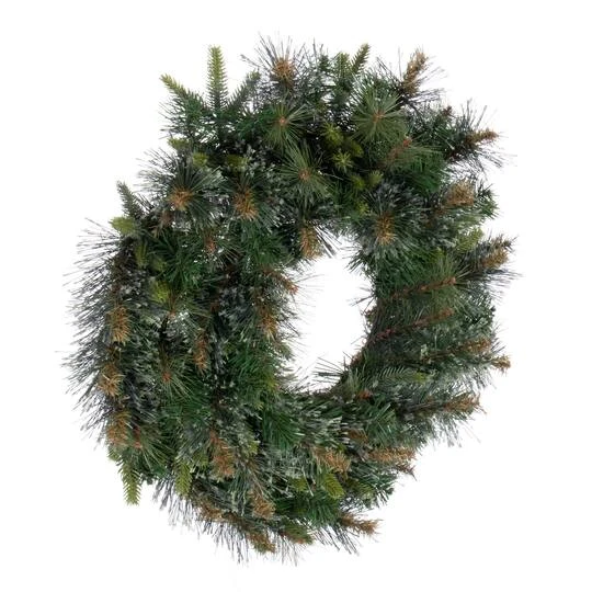 Add some holiday spirit to your front door or mantle with this beautiful green cashmere wreath. This wreath comes unlit and features rich green traditional PE/PVC tips, giving a lush, natural look. It can be used just as it is or customized with your favorite lights, ornaments, ribbons, or holiday picks.