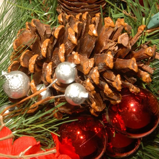This Hydrangea wreath is part of the Decorative Collection line of holiday decorating ideas. Featuring bright red hydrangea flowers, it is trimmed with pine cones, red ball ornaments, silver berries and branch twigs. It is pre-strung with 50 battery-operated warm white LED lights that are energy-efficient and long lasting. 6 hours on/18 hours off timed operation. This wreath can be displayed on doors, walls and windows in indoor or covered outdoor locations.