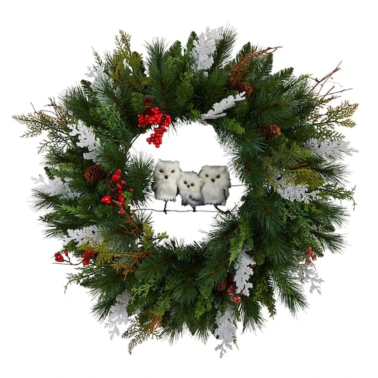 Owl you ready for Christmas? Get ready for the season with this owl Christmas artificial wreath. Crafted from high-quality materials, evergreens in a counter clockwise direction are accented by pine cones, berries and snowflakes. Display your fun personality during the holidays.