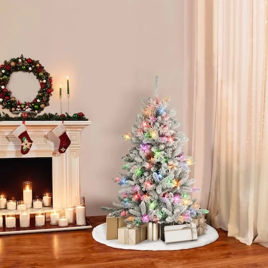 Embrace the joy of the holiday season in your home with this pre-lit flocked Bennington fir Christmas tree from Puleo International. This holiday tree with elegant snow-dusted pine needles stimulates a realistic feel to deliver a perfect touch of snowy ambiance even if a white Christmas is not in the forecast. Decorated with 150 pre-attached UL-listed multicolored incandescent lights, this pre-lit tree illuminates your home with a colorful festive glow while eliminating the time-consuming hassle of hanging lights around your tree. The snow flocked Bennington fir tree has a full and natural appearance with gorgeous life-like branches, and a classic conical shape for an authentic wintry forest impression. Assembly is simple and quick with easy to hinge branches, and a metal stand is included for convenient placement anywhere in your home.