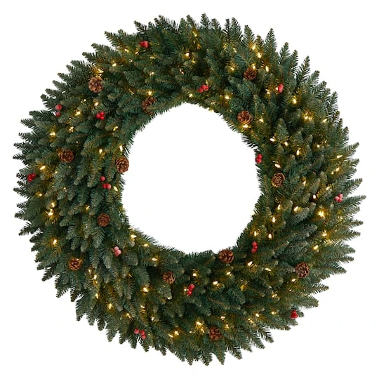 Add the WOW factor to your holiday décor with this flocked artificial Christmas wreath intricately designed from realistic looking pine foliage in a palette of seasonal evergreens flocked in a coat of faux-snow, carefully accented throughout with faux pinecones and berries that look incredibly realistic. Arriving pre-strung with 150 clear LED lights to effortlessly illuminate either a large wall or door, this 4 ft. (in diameter) decorative wreath makes for an inviting accent and will undoubtedly transform any entrance all throughout the holiday season. Perfect for a large space in need of some holiday cheer. Artificial wreaths are manufactured using synthetic materials, such as polyester material or plastic, and are well designed and constructed to be life-like in appearance. This item will need to be re-shaped when removed from the secure box to allow it to reach its fullest size. Your wreath will look beautiful for years to come; simply wipe clean with a soft dry cloth when needed.