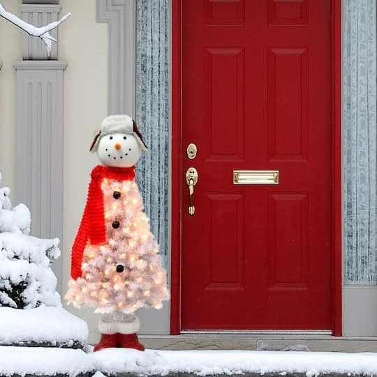 Bring the holiday spirit into your home with this snowman tree. This pre-lit artificial tree features white branches and 100 clear incandescent lights to brighten your home for a dazzling Christmas display. With 3 easy-to-connect sections, this wrapped tree is sure to add warmth to any room or space for years to come. The included sturdy metal base will safely and steadily support your tree and decorations. Plus, if one bulb burns out, the rest remain lit. Constructed from flame retardant and non-allergenic materials, this tree provides a safer alternative to real trees.
