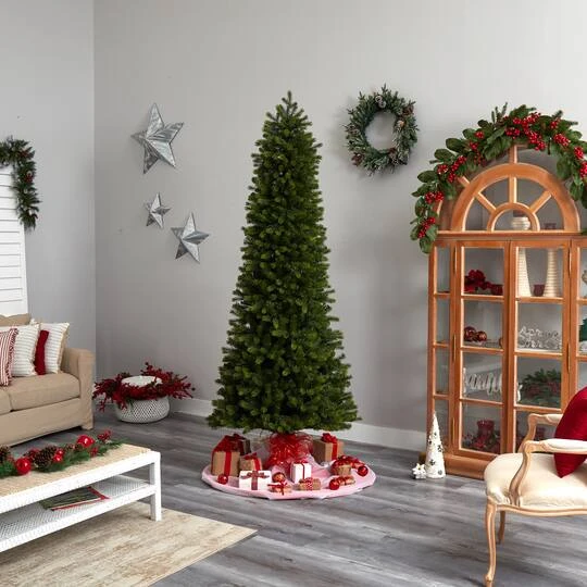 Create a traditional evergreen setting even in the tightest spaces with the help of this artificial Christmas tree. Entirely maintenance free, it features a tight, slimming silhouette made up of mountain greenery with 1664 easy-to-bend branches for showcasing all your holiday ornaments and decorative accents. To eliminate unsightly messes, it already comes pre-strung with 900 warm white micro LED lights (multifunction with remote control); best part, it’s specifically designed with Instant Connect Technology (ICT): a wire-free, through-the-pole lighting system that allows for instant light-up as you build your artificial Christmas Tree; eliminating unsightly tangled wires and the need for plugs, it’s the new go-to for stress-free holiday decorating. Carefully stabilized on a metal stand, this handsome 8.5 ft. tall artificial Christmas tree will not only make decorating a breeze but ensure your home is always holiday-dressed for years to come. Faux Christmas Trees are manufactured using synthetic materials, such as polyester material or plastic, and are well designed and constructed to be life-like in appearance. This item will need to be re-shaped when removed from the secure box to allow it to reach its fullest size. Your artificial Christmas Tree will look beautiful for years to come; simply wipe clean with a soft dry cloth when needed.