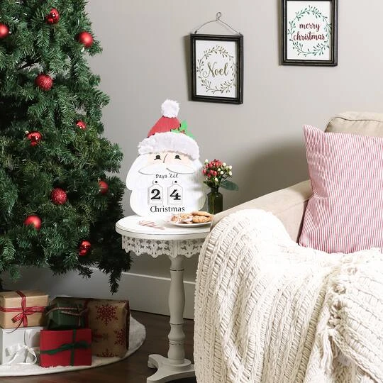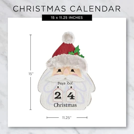 This hanging Santa calendar makes the countdown to Christmas fun for everyone. The entire family can enjoy this hanging wooden sign. Made of wood and tin, this sign can be hung on your door for a magical hello, or indoors to complete your winter wonderland. Date tiles are included.