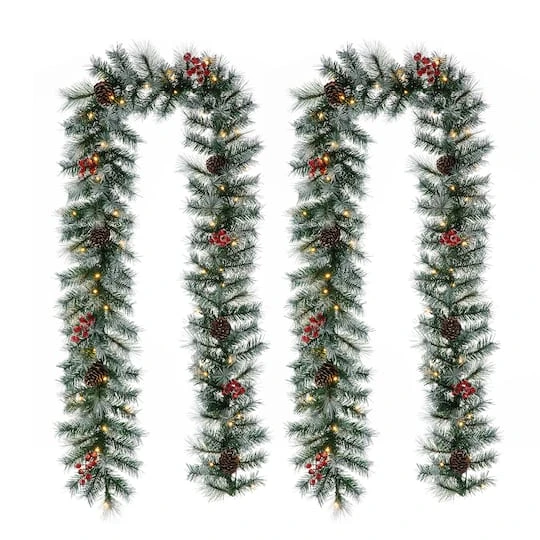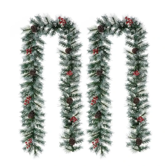 The 9 ft. Frosted mixed tips pine garland provides ample length to easily adorn doors, mantles or banisters, making this versatile decoration ideal for any situation. Each of the 150 tips is modeled to a pine tree’s, while the frosted design creates a winter wonderland around your home. Red berries and pinecones among the needles add an extra holiday touch to this garland.