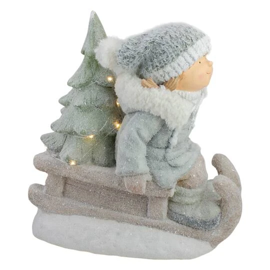 This adorable girl on a sled decoration would be the perfect addition to your Christmas décor this year! Racing home with the Christmas tree on her sled she is happy to join in your festivities. Perfect to place on any tabletop in your home or in a display in your retail store. The figure is fully iced with a glittery finish, and the three is lit with 11 warm white micro bulbs for a festive glow.