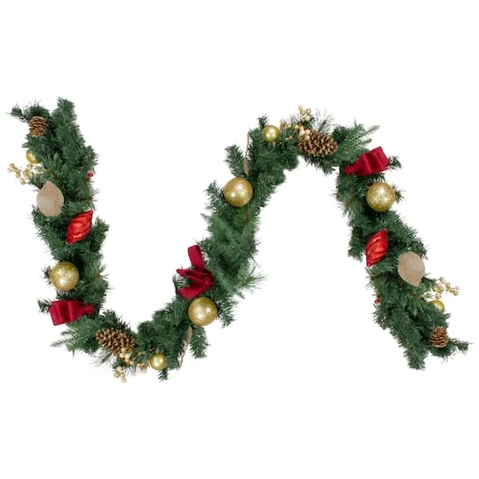 Deck the halls with strings of garland! Add this classy garland to your home décor this season. It features ornaments and ribbon in red and gold paired with pinecones and gold holly. Perfect for hanging down banisters fireplace mantels and more!