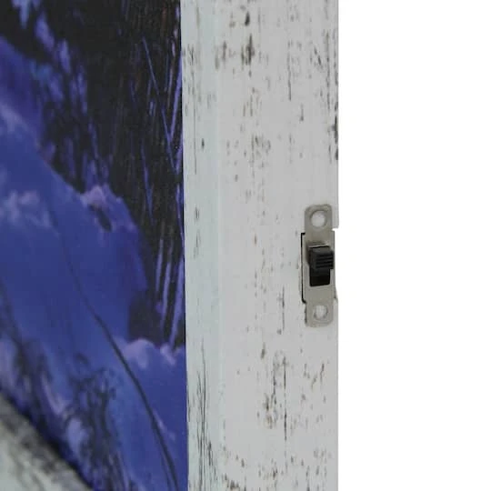 A beautiful wall canvas that is perfect to add to your room’s décor this holiday! The canvas features a Christmas decorated church with LED lighting through the windows. The snowy road leading up to the church shows tire tracks in the snow with a street lamp that lights up with the LED lights behind the canvas. This canvas makes a great addition to your end table mantel or any empty wall space in your home. This canvas is rectangular shaped. Christmas tree is lit with micro LED lights color changing between green to red.