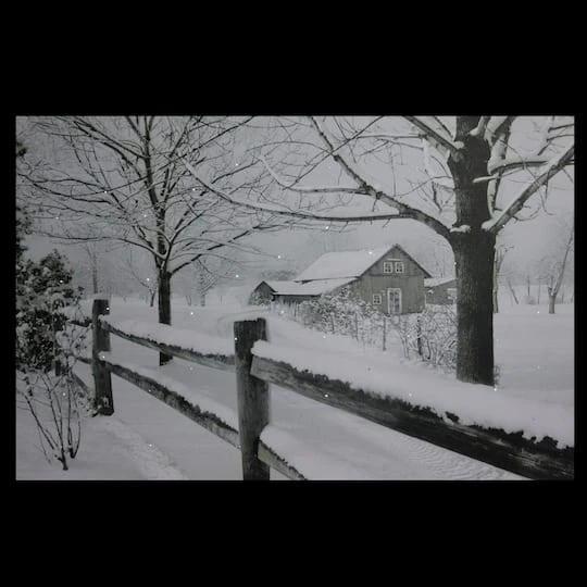 There’s something so pristine about freshly undisturbed fallen snow. This winter scene depicts a snow covered cabin with wooden fence and trees. Pre-lit with twinkling fiber optic pure white lights giving the illusion of falling snow.