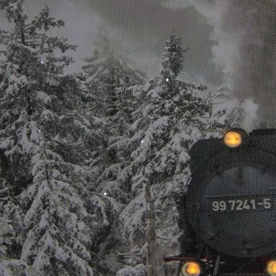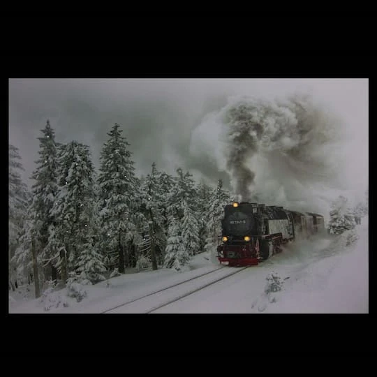 This still-life picture is the perfect addition to your seasonal decor. This winter scene depicts a snowy winter day with a train rolling down the tracks. Pre-lit with 25 fiber optic pure white lights and 3 amber LED lights. Fiber optic lights are set in the trees giving the illusion of falling snow while the LED lights are in the train’s headlights.