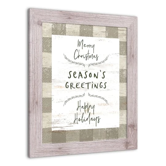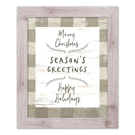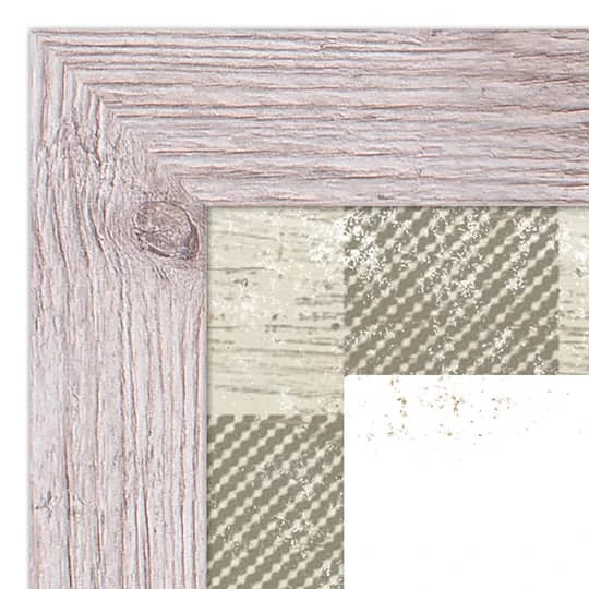 - Taupe and cream buffalo check border with green and white print in white woodgrain frame