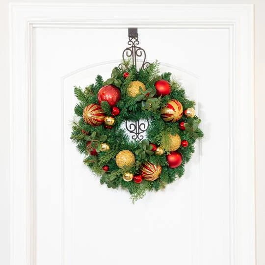 This wreath is a modern 24 in. Christmas wreath which features a handcrafted design complete with red and gold ornaments. Enjoy a modern touch on traditional minimalist wreaths that works great as an indoor or covered outdoor wreath.