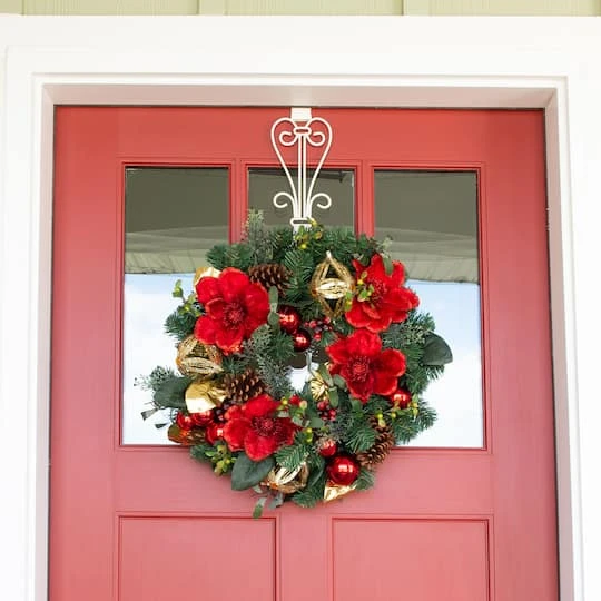 This wreath is a modern 24 in. Christmas wreath which features a handcrafted design complete with red magnolia flowers, gold magnolia leaves, pinecones, berries, and red and gold ornaments. Enjoy a modern touch on traditional minimalist wreaths that works great as an indoor or covered outdoor wreath.
