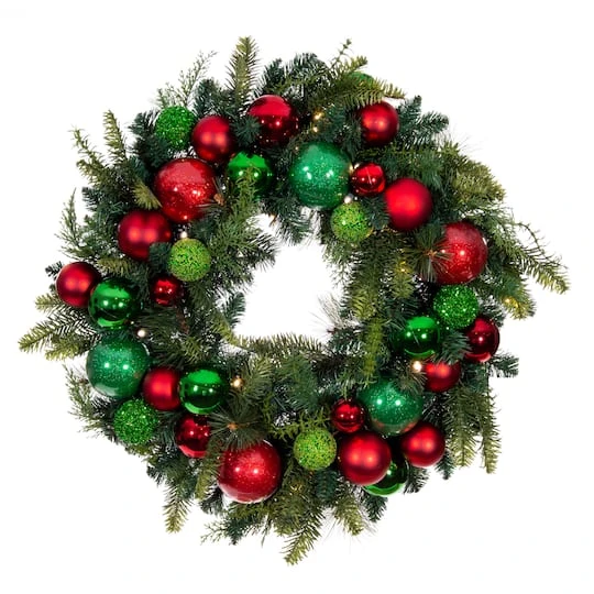 A lighted Christmas wreath is a must have if you want to impress your guests during the holidays, and this one of a kind holiday wreath is sure to meet those expectations. The Christmas Cheer wreath is a pre-lit, remote-controlled, battery-operated Christmas Wreath with 50 LED mini lights. The Christmas Cheer Christmas wreath features a handcrafted design complete with festive red and green ornaments to give a modern touch on traditional Christmas wreaths. This life-like artificial Christmas wreath is perfect either indoors or outdoors, whether you want to hang it above your fireplace mantle, or display it on your front door. Either way, be sure to complete the look with a matching 9 ft. garland to complement your decorated Christmas wreaths with lights!